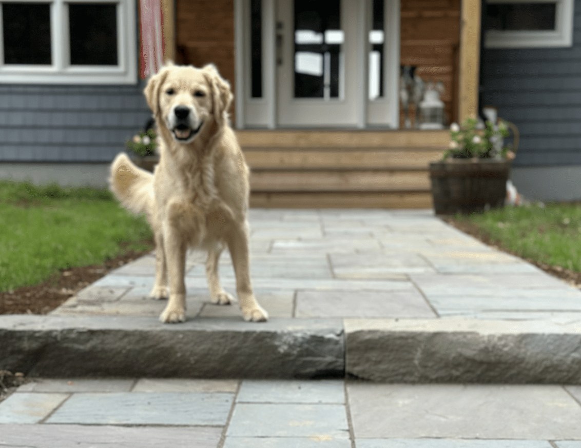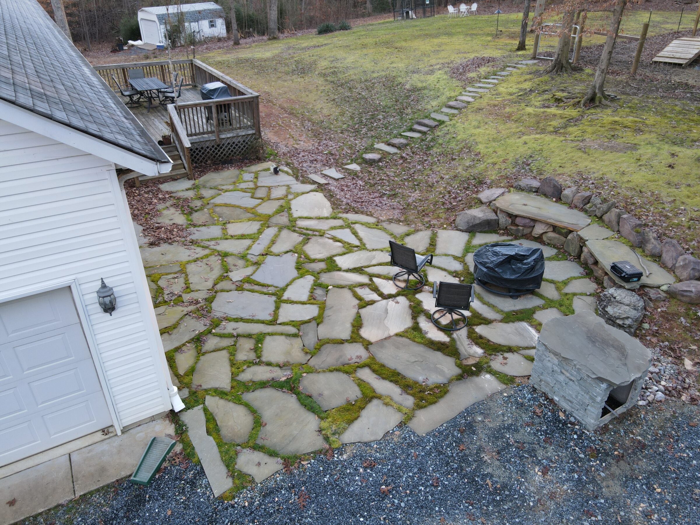 A house with gray shingle siding features a stone patio, covered porch, and outdoor seating surrounded by greenery on a sunny day.