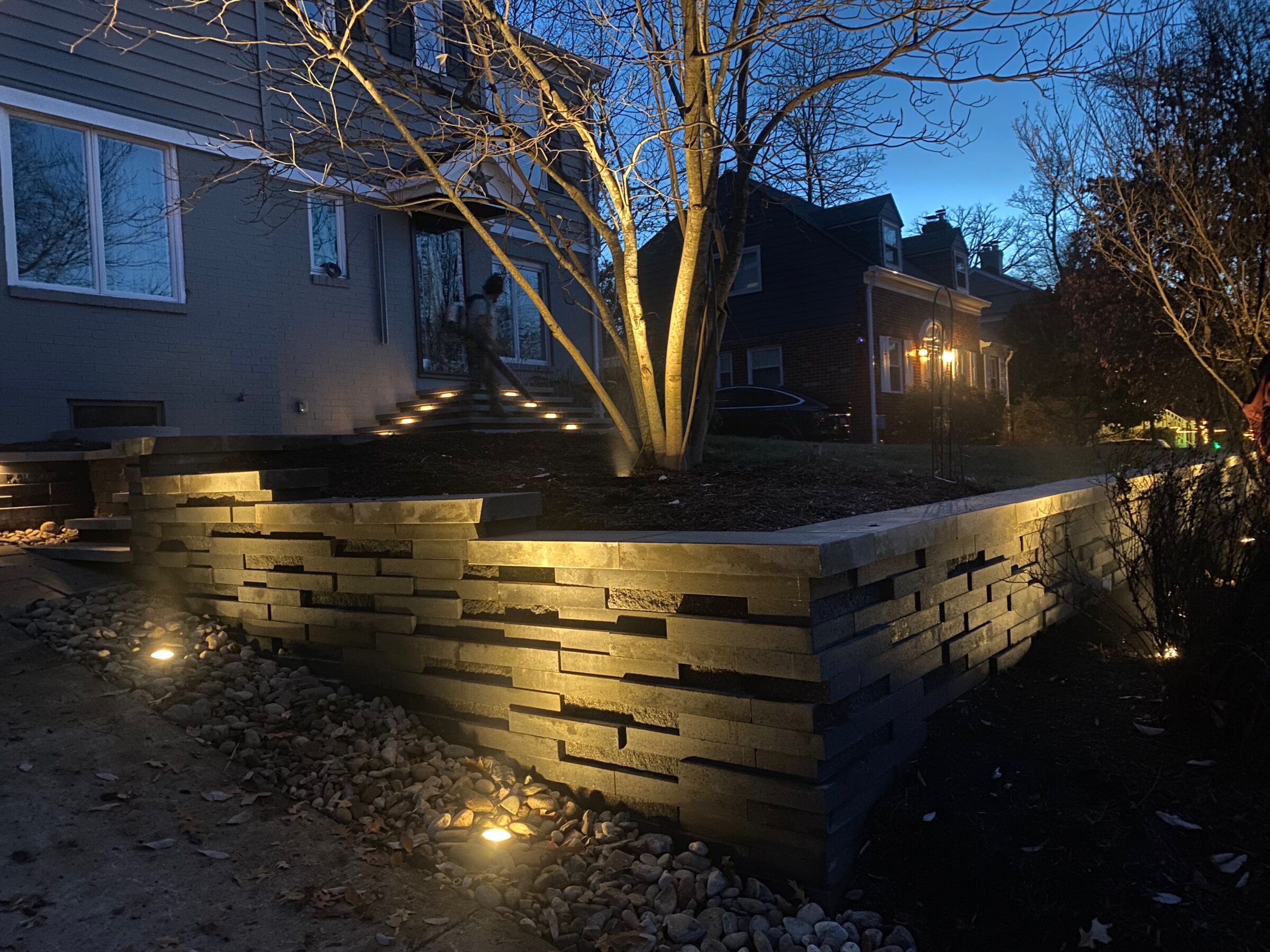 Stone pathway leads to a porch amidst green grass and neighboring houses. Steps and railing enhance the home entrance’s inviting feel.